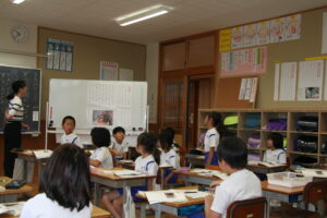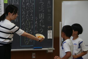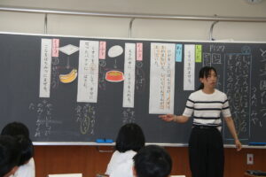 子供たちは、ケガをしたニホンザルにくすりを飲ませるために、じゅういさんが行った3つの工夫について発表をしていました。授業では、その3つの工夫の理解を助けるために、イラストや実物を準備して行いました。意欲的に授業に臨んでいる子供たちの様子をご覧ください。
