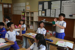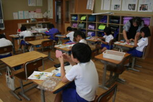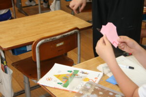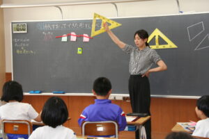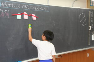 その後、子供たちは、折り紙角が直角かどうかを確認するために、初めて三角定規を使います。