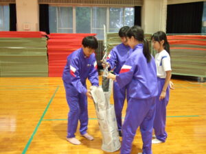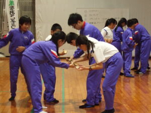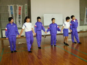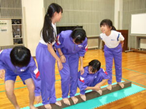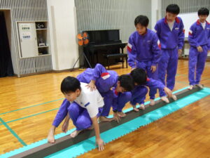 〇ラインナップ(丸太の上に一列に並び、順番を入れ替える。丸太から落ちてはいけない)