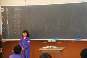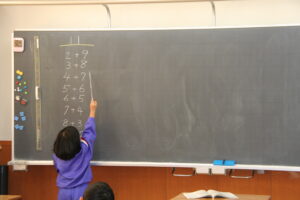 答えが「11」になる足し算は、どんな計算か、黒板に書いてあります。