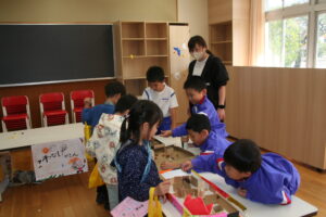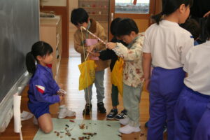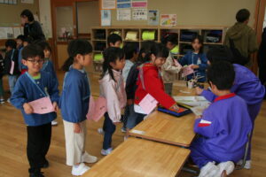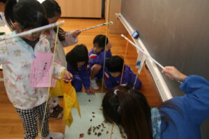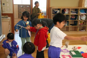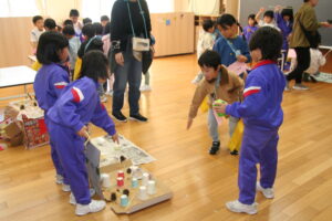 つり、どんぐりめいろ どんぐりコマ けん玉 輪投げ などのお店を出し、保育所の年長児と交流しました。1年生の子供たちが、プログラムを作ったり司会進行したりして、楽しく交流できました。
