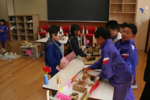 1年生の子供たちが生活科の時間に、松ぼっくりやどんぐり等を利用して、遊び道具を作りました。