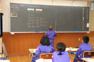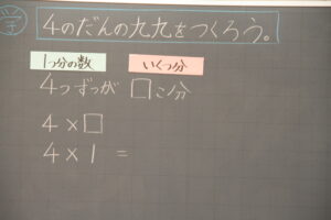 2年生算数科の学習です。今日は、4の段のかけ算の学習です。