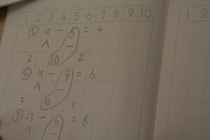 引かれる数を10と〇に分けて、10ー△ をしてから、その答えと〇を足して答えを求めています。ノートのますの中にしっかりと数字を書いています。