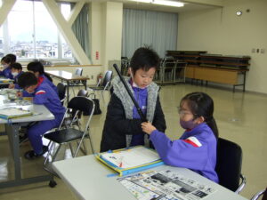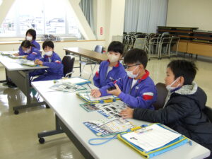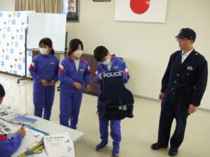 犯罪や交通事故からの安全を守る警察署の見学では、令和6年度に起きた犯罪の件数を教えていただいたり、おまわりさんが日頃持ち歩いているものを実際に触らせていただいたりしました。