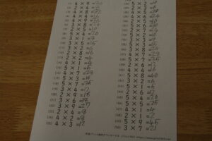 「九九はかせ」になるために、子供たちが、九九表を手に、先生に九九を聞いてもらっています。
