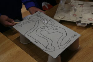 ・とことこくるま・・・・ラーメンカップで作ったおもちゃ車を動かし、止まった所の得点を競う