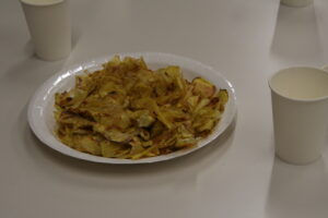サツマイモのチップスを作っていました。準備が整い、ジュースで乾杯。