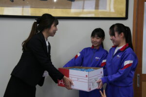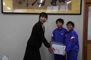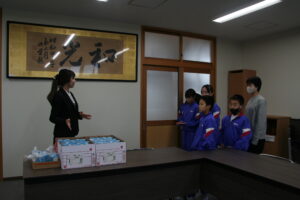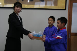 全校で集めた赤い羽根共同募金を、企画委員会の5・6年生が代表して、入善町社会福祉協議会に渡しました。