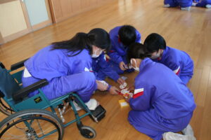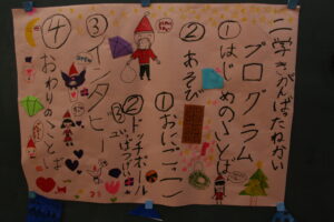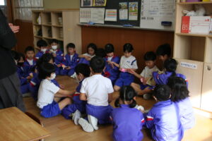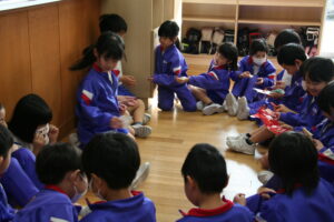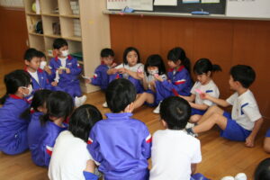 1年生は、輪になって座り、手作りのプレゼントをもち、音楽に合わせて隣の友達にそのプレゼントを渡していました。
