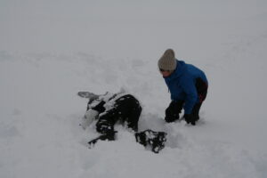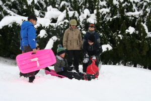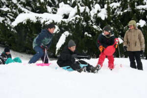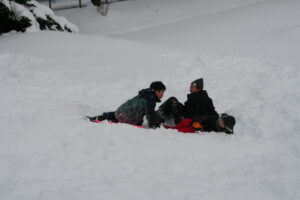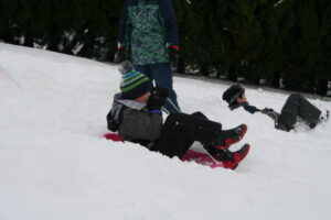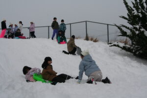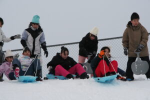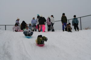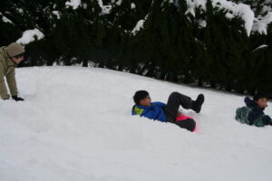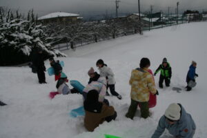 そんな新雪の中、グラウンドのスキー山に6年生が向かっています。