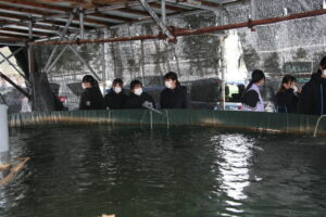 深層水パークでは、実際に取水しているところ(海面ー6m)を見学させていただき、イカが深層水と一緒に取り入れられている現場も見学したり、実際に深層水をなめてみたりしました。また、深層水をとり居ている取水管を触り、これが能登半島地震で破断したという話も聞き、改めて地震のエネルギーの大きさを実感しました。また、深層水を生かしたサクラマスの養殖施設も見学させていただきました。