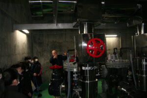 深層水パークでは、実際に取水しているところ(海面ー6m)を見学させていただき、イカが深層水と一緒に取り入れられている現場も見学したり、実際に深層水をなめてみたりしました。また、深層水をとり居ている取水管を触り、これが能登半島地震で破断したという話も聞き、改めて地震のエネルギーの大きさを実感しました。また、深層水を生かしたサクラマスの養殖施設も見学させていただきました。