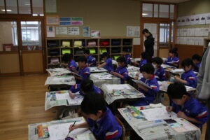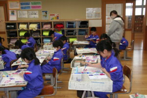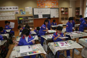 1年生図画工作科の学習です。水彩絵の具(赤と青)を使って、紫色をつくる混色づくりの学習です。赤色と青色の絵の具の加減で、紫色でも赤色に近い紫色、青色に近い紫色ができます。