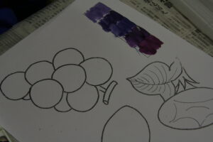 子供たちは、その加減を楽しんで、いろいろな紫色をつくり、ナスやアサガオの色塗りをして楽しんでいます。子供たち一人一人のナスやアサガオができました。
