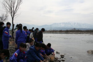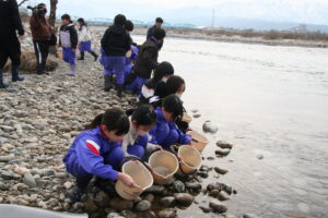 黒部川内水面漁業協同組合、入善町教育委員会のご支援で、4年生の子供たちが、黒部川でサケの稚魚の放流を行いました。今日、放流した稚魚は、4~5年かけ、ロシアの方まで行き、黒部川に戻ってくるそうです。子供たちは、「また帰ってきて」と稚魚に声をかけて放流していました。