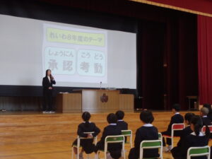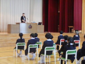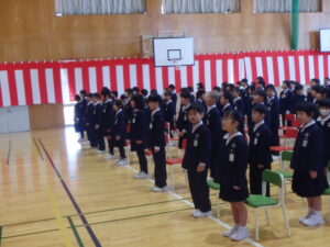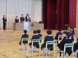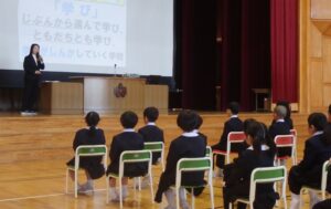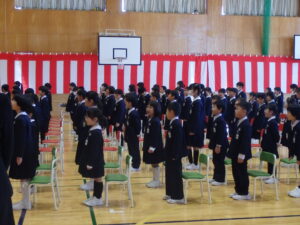 始業式では、校長から「しんかする学び」「飯野だいすき」「いいとこメガネ」「飯野ゲンキッズ」と題して、「学びをどんどん進化させよう」「飯野地区のいいところを見つけて、大すきになろう」「友達のいいところを見つけよう」「体も心も元気になろう」の4つのことを伝えました。しっかりと話を聞く子供たちの素晴らしい姿が見られ、とても嬉しく思っています。