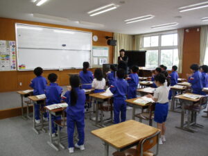 2年生の音楽の時間はとても楽しそうです。「子犬のビンゴ」の曲に合わせて、大きな声で歌いながら体全体を使って表現していました。音楽の楽しさやおもしろさを感じることができる2年生です。