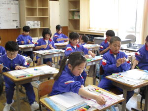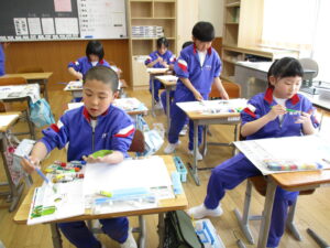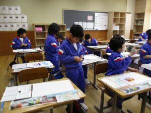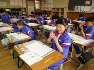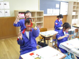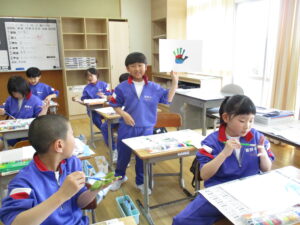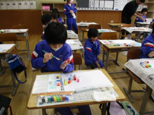 3年生は、皆で話し合って、「知・徳・体」の3つの学級目標が決まりました。今日の図画工作科の時間は、その学級目標のちかいの手形を製作しました。自分が選んだ色を手に上手に塗って、手形を完成させました。淡いピンク色や紫色、虹色等、自分が描く一人一人の素敵な手形が出来上がりました。学級目標が教室に飾られるのが楽しみです。