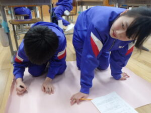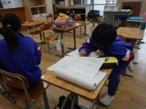企画委員会は、「1年生おめでとう集会」に向けた準備を進めていました。放送委員会は、昼の放送内容の予定を決め、年間の活動計画の作成に取り組みました。環境・体育委員会は、落ち葉の片付けや、畑や花壇で使う肥料運びを行いました。図書委員会は、掲示物の掲示や貸し出しの役割分担、全校のみんなが本に親しめるようにするための活動について話し合いました。給食委員会は、バースデーカードの掲示やランチルームの手洗い場の掃除を行いました。保健委員会は、清潔検査の準備や歯みがき週間に向けた相談を進めていました。